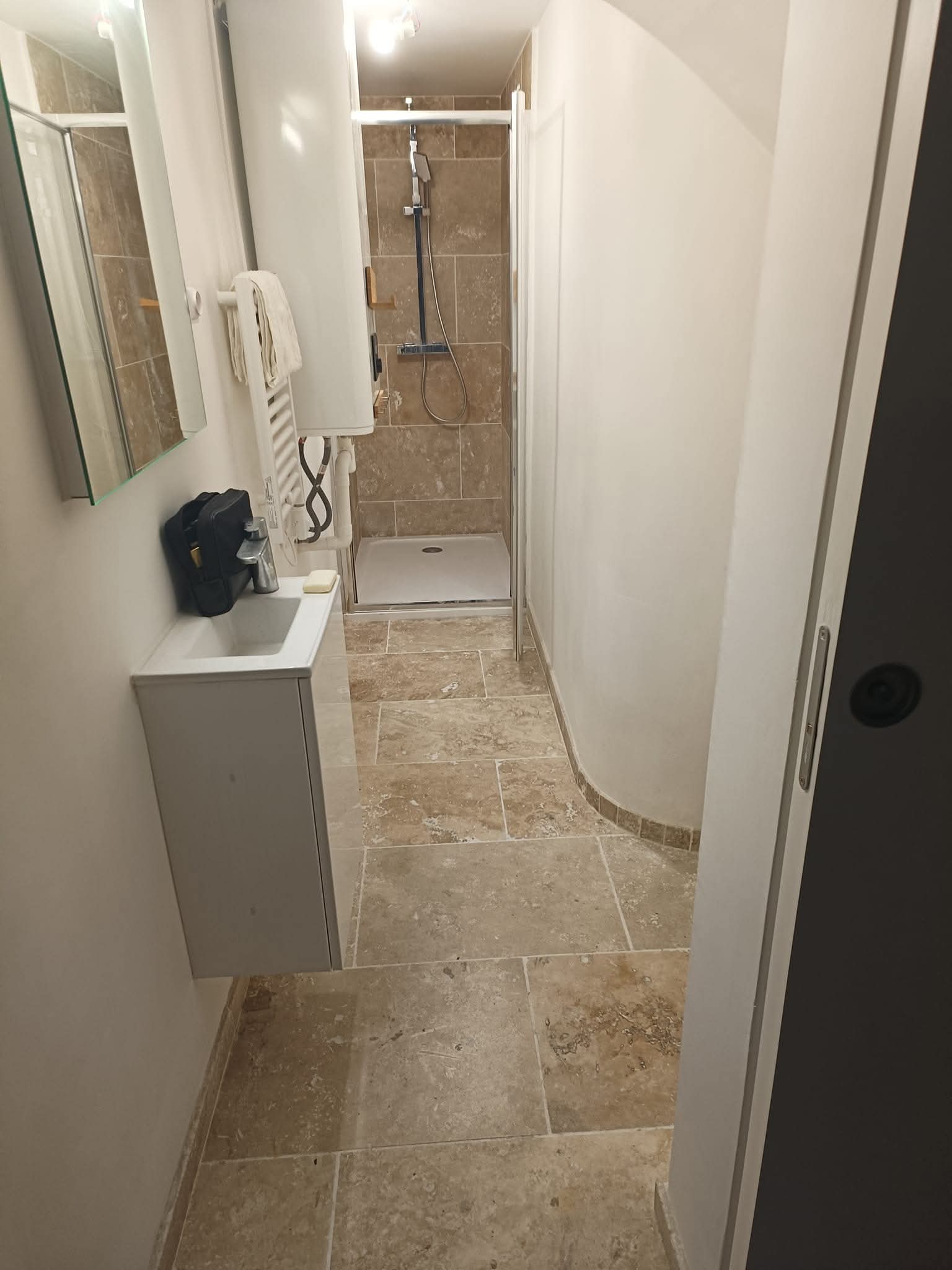 Pose de carrelage au sol (grand format, travertin) et faïence murale pour cuisines et salles de bain.